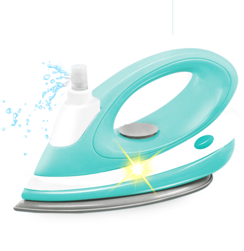 Žehlička v modernom dizajne, ktorá svieti a rozprašuje vodu. Veľkosť 25x12x15 cm.