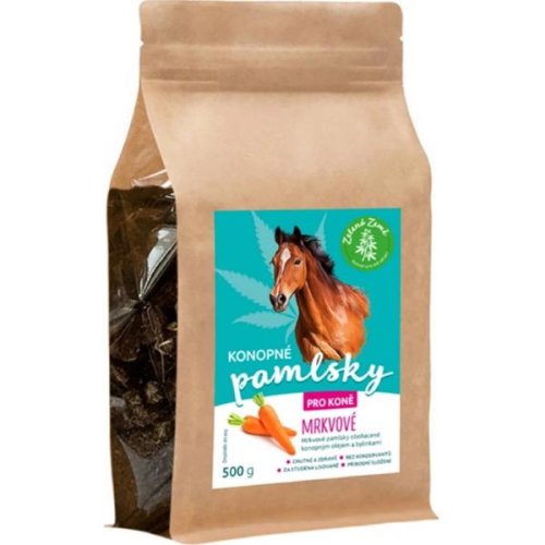 Mrkvové maškrty obohatené bylinkami a konopným olejom sú zdravou odmenou vhodnou pre kone všetkých plemien a vekových kategórií. Receptúra je čisto prírodná, bez obilnín (grain-free) a konzervantov. Maškrty sú lisované za studena, takže nedochádza k znehodnoteniu prospešných látok v bylinkách a konope. Semienka slnečnice patria medzi najbohatší zdroj vitamínu E. Bylinky v maškrtách majú protizápalové účinky a podporujú chutnosť. Konopný olej pôsobí priaznivo na kvalitu srsti a kopýt. Zloženie: karotka, semienka slnečnice, nechtík lekársky, citrónová tráva, konopný olej. Analytické zložky: hrubý proteín 11,6 %, hrubý tuk 16,3 %, hrubá vláknina 29,9 %, hrubý popol 11,1 %, vlhkosť 6,3 %. Metabolizovaná energia: 3 300 kcal/kg Kŕmny návod: Dávkujte iba ako odmenu. Nepoužívajte ako kompletné kŕmenie. Zviera by malo mať neustále k dispozícii čerstvú pitnú vodu. Upozornenie: Skladujte na suchom mieste pri izbovej teplote. Uchovávajte mimo dohľadu a dosahu detí. Len pre zvieratá. Nepoužívať u koní, ktorých mäso je určené na ľudskú spotrebu. Prípravok nie je náhradou veterinárnej starostlivosti a liečiv odporúčaných veterinárnym lekárom.