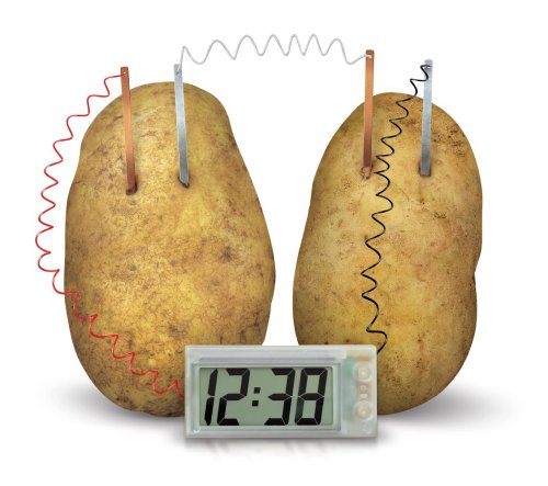 Ako to funguje (elektrochemický článok): Deti zapichnú do dvoch zemiakov zinkovej (záporná elektróda) a medené (kladná elektróda) prúžky. Zemiaka (alebo iné ovocie/zelenina, ako je citrón či jablko) slúži ako elektrolyt – vodivý roztok, ktorý umožňuje chemickú reakciu. Rozdiel v redox potenciálu medzi zinkom a meďou generuje malé napätie a prúd, ktoré postačia na pohon digitálnych obrazovky hodín.