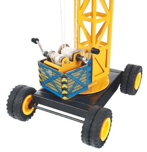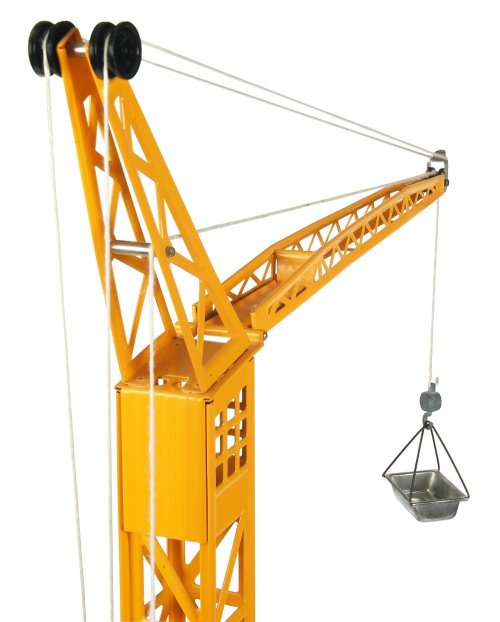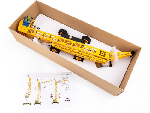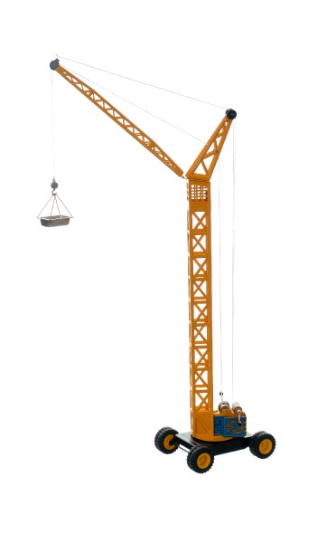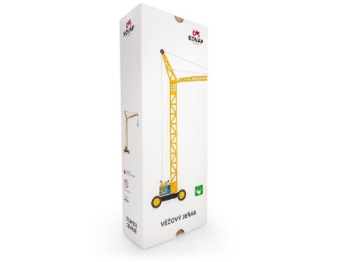 Plne funkčný model žeriava Kovap. Výška kovového žeriava je 60 cm. S hračkou je možné jazdiť, otáčať vežu žeriava, nakláňať rameno a zdvíhať bremená.