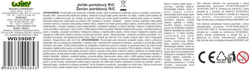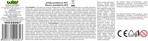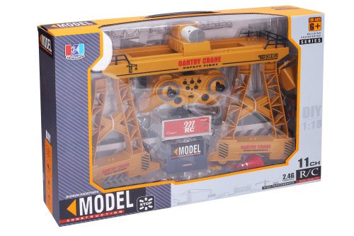 Žeriav portálový RC na diaľkové ovládanie. Rozmery 33x17x27 cm. Súčasťou žeriav, naberacia nádoba, kontajner, 2 barely, 2 klády, 2 kužele. Frekvencia 2.4GHz. Svetelné a zvukové efekty. Ovládač - pohyb dopredu, dozadu, otáčanie na mieste, ľavé veľké tlačidlo - zdvíhanie nákladu, pravé veľké tlačidlo - pokladanie nákladu, 5 malých tlačidiel - klaksón, svetlo, zvukové efekty, štartovanie, demo režim. 3.7V batériový pack do žeriava súčasťou, 2xAA do ovládača nie sú súčasťou. USB kábel súčasťou. Prepínač ON/OFF žeriava a na ovládači.