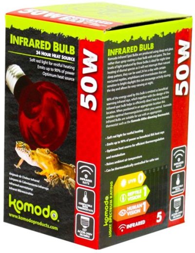 Terárijná žiarovka Komodo Infrared Spot Bulb z červeného skla vydáva tlmené červené svetlo, ktoré umožňuje nočné pozorovanie živočíchov bez narušenia ich prirodzeného spánkového cyklu. Až 90 % spotrebovanej energie pritom vychádza zo žiarovky v podobe tepelného žiarenia, ktoré je možné vďaka konštrukcii banky smerovať na konkrétne vyhrievacie miesto. Žiarovka je vhodná nielen na nočné vyhrievanie terárií s dennými živočíchmi, ale môže slúžiť aj ako dvadsaťštyrihodinový zdroj tepla. U niektorých svetloplachých nočných plazov, obojživelníkov a bezstavovcov môže tiež podporiť aktivitu počas dňa. Výhody: