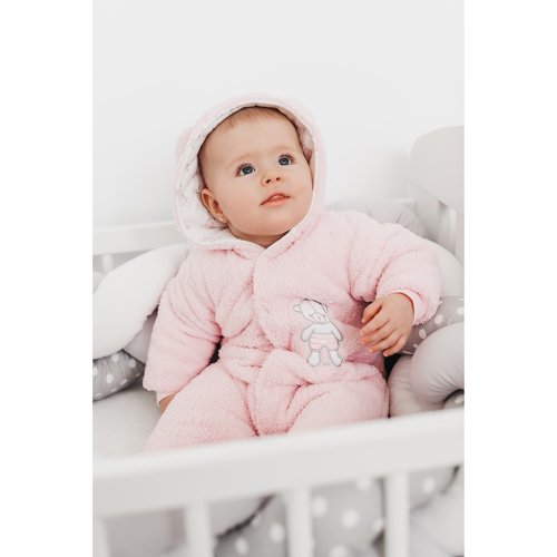 Praktická zimná dojčenská kombinéza s kapucňou New Baby Nice Bear pre Vaše bábätko. Zimná kombinézka je vyrobená z dvoch vrstiev kvalitného materiálu - vrchného hrubšieho, hrejivého fleecového materiálu a spodnej bavlnenej podšívky. Kombinézku zdobí obrázok medvedíka. Má praktickú kapucňu s roztomilými uškami a teplučké rukavičky na šnúrke. Zapínanie na cvočky po celej dĺžke a medzi nožičkami. Zloženie: vrchná vrstva 80% bavlna, 20% polyester, podšívka: 100% bavlna, výplň: antialergické vlákno. Rozmery: obvod okolo hrudníka cca 61 cm, dĺžka rukáva cca 24 cm, celková dĺžka cca 60 cm, dĺžka rukavičiek cca 12 cm.