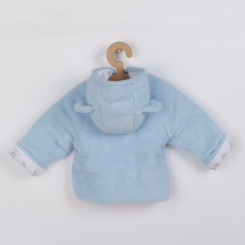 Zimný dojčenský kabátik s kapuckou New Baby Nice Bea. Zimný kabátik je vyrobený z dvoch vrstiev kvalitného materiálu - vrchného hrubšieho, hrejivého fleecového materiálu a spodnej bavlnenej podšívky, ktorá je celopotlačená medvedíkmi. Kabátik zdobí obrázok medvedíka a má praktickú kapucňu s roztomilými uškami. Zapínanie na cvočky po celej dĺžke. Zloženie: vrchná vrstva 80% bavlna, 20% polyester, podšívka: 100% bavlna, výplň: antialergické vlákno.