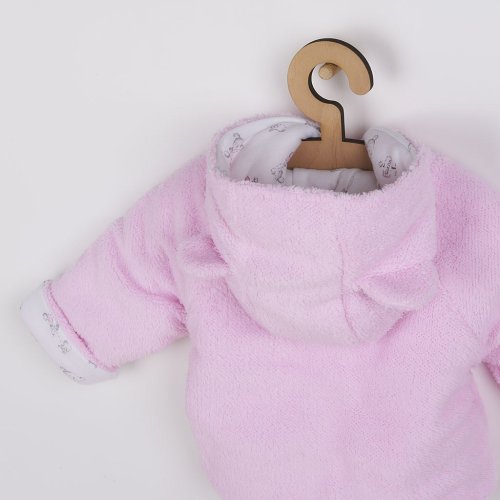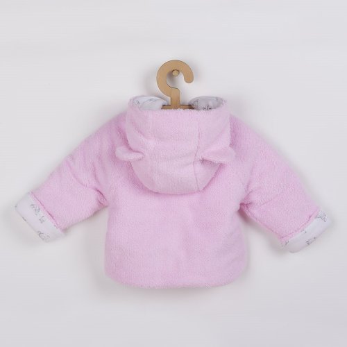 Zimný dojčenský kabátik s kapuckou New Baby Nice Bea. Zimný kabátik je vyrobený z dvoch vrstiev kvalitného materiálu - vrchného hrubšieho, hrejivého fleecového materiálu a spodnej bavlnenej podšívky, ktorá je celopotlačená medvedíkmi. Kabátik zdobí obrázok medvedíka a má praktickú kapucňu s roztomilými uškami. Zapínanie na cvočky po celej dĺžke. Zloženie: vrchná vrstva 80% bavlna, 20% polyester, podšívka: 100% bavlna, výplň: antialergické vlákno.