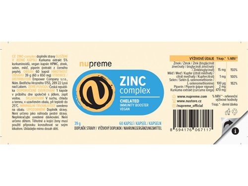 Výživový doplnok Zinok chelát obsahuje pre organizmus dôležité minerály ako je zinok, selén a meď, ktoré sú doplnené extraktmi z korenia az kurkumy. Zinok a selén sú v organickej podobe, ktorá má lepšiu biologickú dostupnosť a vstrebateľnosť. Zinok, selén a meď napomáhajú zdravej imunite. Kurkumín a piperín sú významnými antioxidantmi. Majú pozitívny vplyv na naše trávenie, činnosť pečene a stav kĺbov.