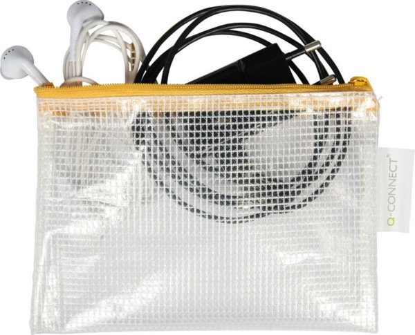Vystužená sieťovaná obálka na zips Pevné a funkčné úložné priestory, ktoré sú dokonale navrhnuté pre ukladanie rôznych drobností Vrecko je vyrobené z priehľadného 250mic EVA V hornej časti je žltý zips Originálny …