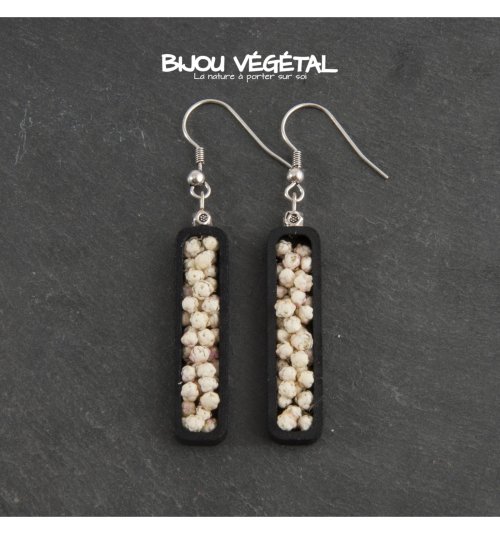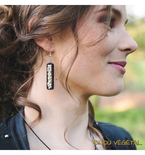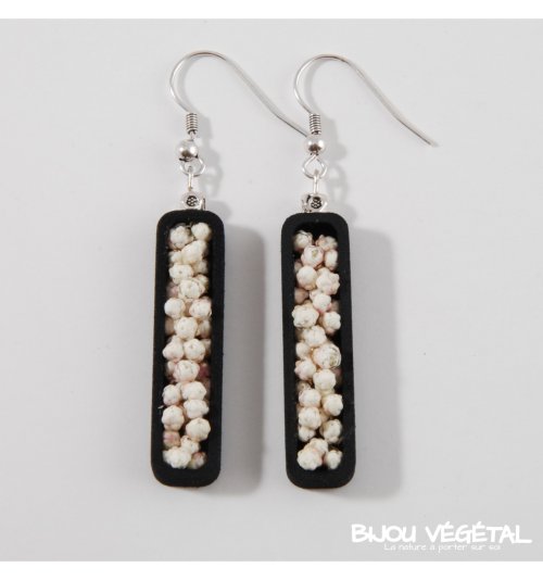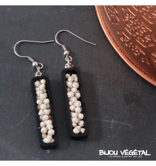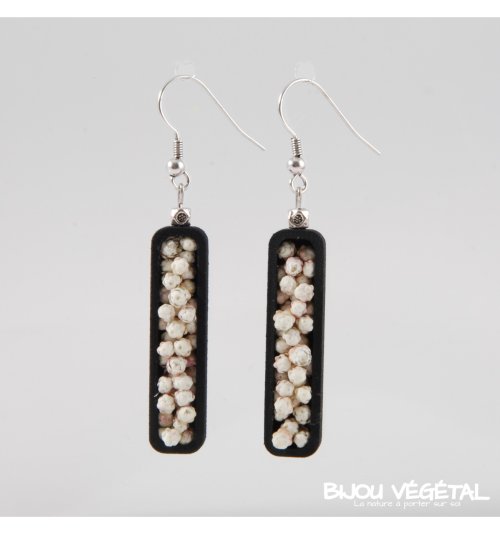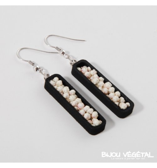 Živé šperky - Náušnice Jardiniere čierne s trvalými bielymi kvetmi Nádherný módny doplnok vo výraznej farbe v kombinácii s trvalými bielymi kvetmi vytvára neobyčajný elegantný živý šperk. Živé šperky sú stabilizované patentovanou technológiou a nepotrebujú prakticky žiadnu údržbu. Živé šperky sú balené v krabičke, súčasťou balenia je náhradná trvalá rastlina. Živé šperky sú vyrobené ručne vo Francúzsku. Výrobca garantuje neobmedzenú životnosť, pri vhodnom používaní. Živé šperky nesmú byť vystavené veľkým teplotným zmenám a priamemu prúdu vody (pri kúpaní, umývaní riadu a pod.) Živé šperky boli prvýkrát predstavené na medzinárodnom veľtrhu klenotov Bijorhca v Paríži roku 2015. Capucine. Živé šperky umožňujú stále prepojenie s prírodou a prinášajú ju doslova na dosah ruky. Francúzska značka Radis et Capucine