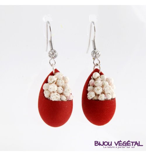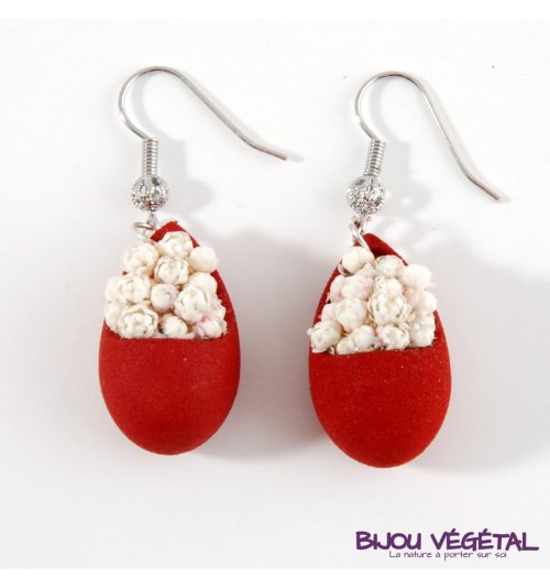 Živé šperky - Náušnice Slza červené s trvalými bielymi kvetmi Nádherný módny doplnok vo výraznej farbe v kombinácii s trvalými bielymi kvetmi vytvára neobyčajný elegantný živý šperk. Živé šperky sú stabilizované patentovanou technológiou a nepotrebujú prakticky žiadnu údržbu. Živé šperky sú balené v krabičke, súčasťou balenia je náhradná trvalá rastlina. Živé šperky sú vyrobené ručne vo Francúzsku. Výrobca garantuje neobmedzenú životnosť, pri vhodnom používaní. Živé šperky nesmú byť vystavené veľkým teplotným zmenám a priamemu prúdu vody (pri kúpaní, umývaní riadu a pod.) Živé šperky boli prvýkrát predstavené na medzinárodnom veľtrhu klenotov Bijorhca v Paríži roku 2015. Capucine. Živé šperky umožňujú stále prepojenie s prírodou a prinášajú ju doslova na dosah ruky. Francúzska značka Radis et Capucine