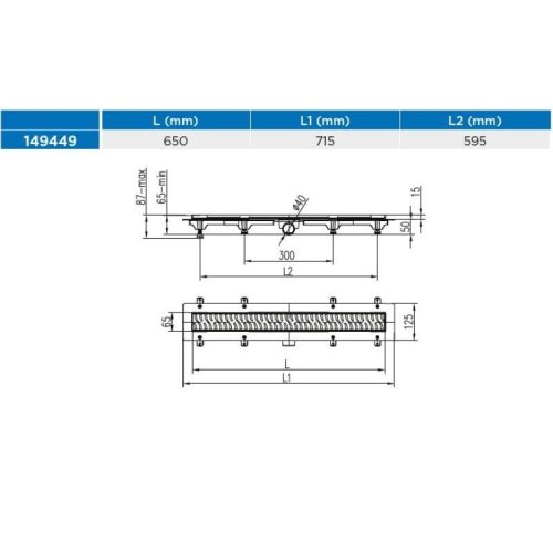 Žľab podlahový lineárny 650 mm, D 40 mm, bočné, square mat, ENPRO