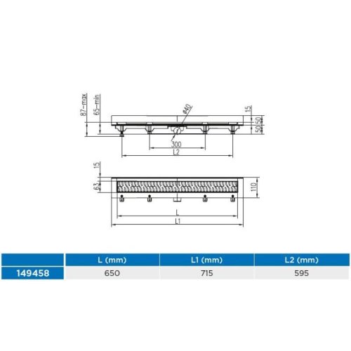 Žľab podlahový lineárny k stene 650 mm, D 40 mm, bočné, square mat, ENPRO