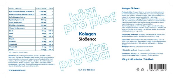 Kolagén českej značky Zložené: v kapsuliach, s mimoriadne silnou dennou dávkou 3000 mg prvotriedneho rybieho kolagénu VERISOL® vo forme bioaktívnych peptidov, 400 mg hovädzieho kolagénu VERISOL®, 40 mg kuracieho kolagénu typu II, 120 mg kyseliny vita B3 a B7, zinkom, ginkgo bilobou a ďalšími zdraviu prospešnými látkami, priamo podporuje obnovenie pružnosti pokožky a jej zdravia, a súčasne zlepšuje kvalitu vlasov a nechtov. Pretože za týmito nežiaducimi prejavmi stojí prirodzený úbytok kolagénu, je v takej chvíli najefektívnejšie siahnuť po doplnku stravy s vysokým obsahom kvalitného kolagénu. Ten je totiž schopný vytvárať väzbu s existujúcimi kolagénovými štruktúrami v spomínaných problematických miestach a dokáže veľmi efektívne znovuobnoviť pružnosť a hladkosť pokožky. Rovnako tak kolagén Zložené: pomáha navrátiť vlasom a nechtom ich pevnosť a odolnosť. Účinnosť tohto doplnku stravy je viditeľná už po 3-4 týždňoch užívania a jeho ojedinelé vlastnosti ocenia najmä ženy, ktoré sa starajú o svoju pleť, vlasy a nechty. Odporúčané dávkovanie: