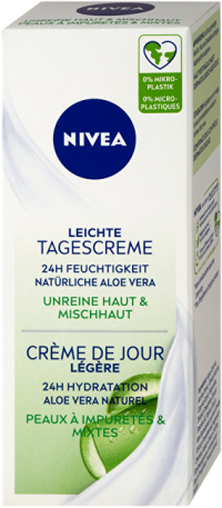 Zmatňujúci denný krém je skvelým doplnkom vašej každodennej starostlivosti o zmiešanú pleť so sklonom k masteniu. Intenzívne hydratuje až 24 hodín a vyrovnáva prirodzenú úroveň hydratácie pleti. Ľahké zloženie s NIVEA® Moisture Care komplexom, prírodným aloe vera a minerálmi redukuje kožný maz a znižuje lesk pleti. Samozrejme sa tiež rýchlo vstrebáva. Uvidíte aj pocítite rozdiel. Pleť je každý deň dlhodobo hydratovaná a zmatnená. Kompatibilita s pleťou bola dermatologicky schválená. Zloženie je vegánske - neobsahuje ingrediencie živočíšneho pôvodu.