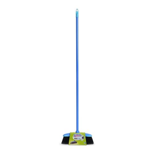Plastový zmeták s tyčou, dva druhy vlákien, jemné čierne štetiny zametú prach, silné šedé zametú ťažšiu špinu