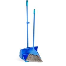 Plastová zmetáčková súprava s lopatkou s dlhou rukoväťou. V modrej farbe. Umožňuje zametanie podlahy bez nutnosti ohýbať sa
