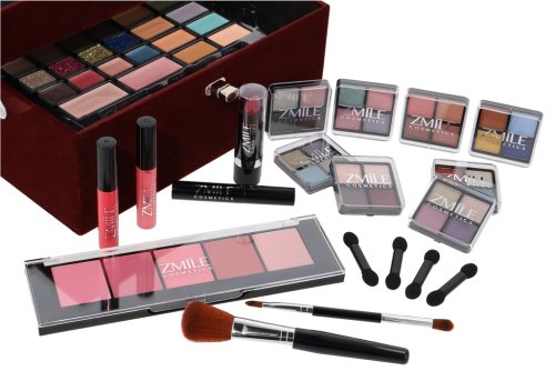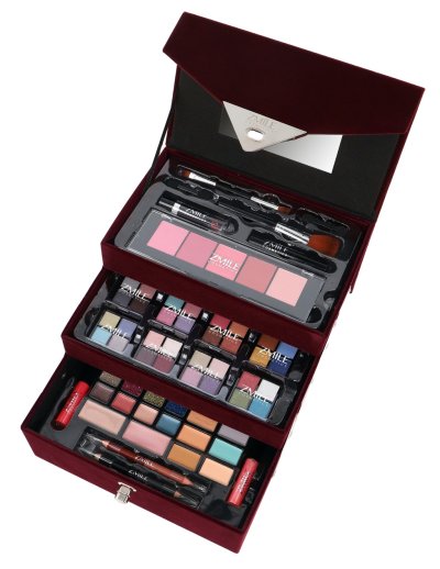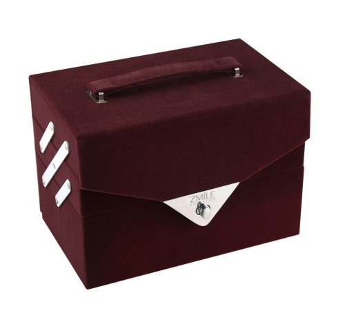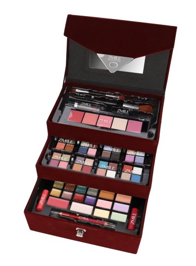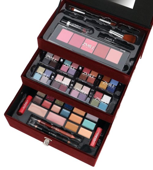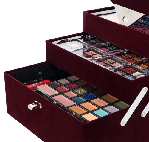 Kozmetický kufrík zamatový Beauty Case Velvety - zamatový tmavo vínový - celkom 74 ks príslušenstva. . Obsahuje 32× očnými tieňmi v 4 kompaktných kazetách, 5× tvárenku, 3× tiene na obočie, 1×vosk na obočie, 4× krémové očné tiene, 4× krém s trblietkami, 2× základné očné tiene, 8× korektor, 2× lesk na pery, 1× žku na oči, 1× obojstrannú ceruzku na pery, 1× štetec na tvárenku, 1× obojstranný štetec na tiene, 4× obojstranný aplikátor, 1× integrované zrkadlo. Dermatologicky testované, vyhovuje prísnym normám EÚ.
