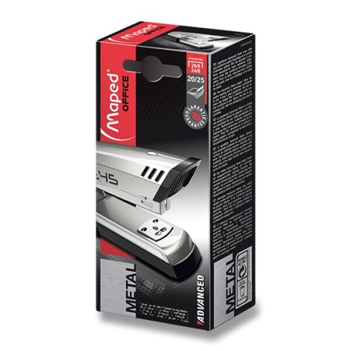 • možnosť vizuálnej kontroly drôtikov, * zásobník pre náhradné drôtiky v zadnej časti, * pohodlné plnenie zásobníka po roztvorení zošívačky do uhla 180°, * hĺbka vkladania papiera 52 mm, * drôtiky Maped 24/6 na 20 listov, 26/6 na 25 listov