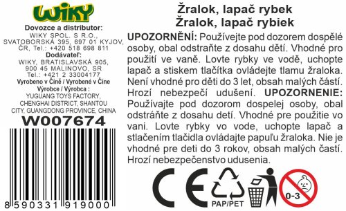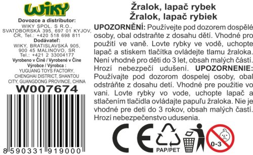 Žralok, lapač rybičiek. Balenie obsahuje lapač v tvare žraloka a 4 rybičky. stlačením spúšte na chvoste žraloka ovládate jeho papuľu. Tryme funkcie na obale.