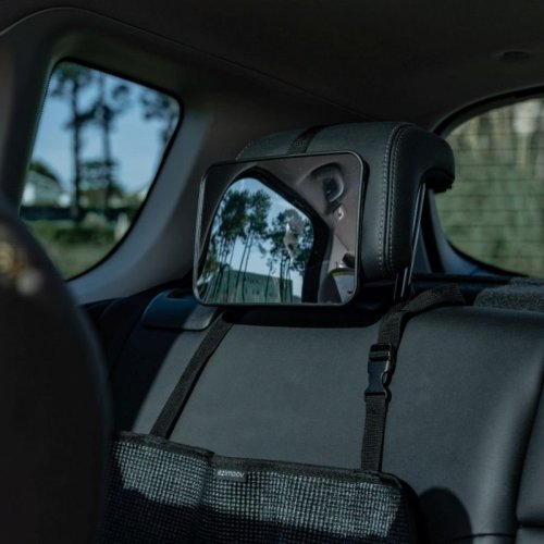 Mierne zaoblené zrkadlo, ktoré sa upevňuje na opierku hlavy zadného autosedadla.