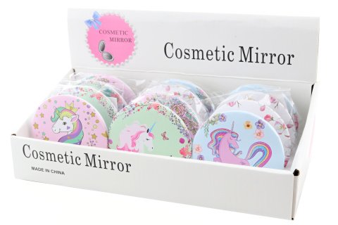 Okrúhle zrkadlo s motívom jednorožcov. Priemer cca 7 cm. Materiál plast. Balené v sáčku. Viac druhov - dodávame podľa skladovej dostupnosti. Výrobok nie je hračka.