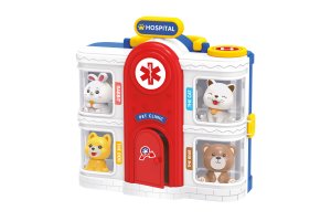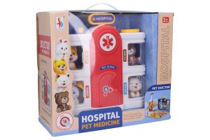 Zvieracia nemocnica prenosná s efektmi. Rozmery kufríka 28x14x28 cm. Svetelné efekty - stetoskop, bezkontaktný teplomer, oba vnútorné balkóny (prepínače ON/OFF). Obsah - rozkladacia nemocnica s manuálnym výťahom, 4 zvieratká - psík, mačička, medvedík, králiček, nástroje - stetoskop, teplomer, injekcia, nožnice, kliešte, pilulky. Používajte podľa obrázkov na obale. 2xAG10 batérie do osvetlenia každého balkóna, 2xAG10 do stetoskopu, 2xAG10 do teplomeru súčasťou.