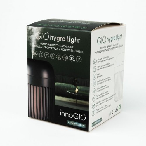Ultrazvukový zvlhčovač vzduchu GIOhygro Light s osvetlením je návrhom pre tých, ktorí ocenia funkčnosť a účinnosť. Vďaka ultrazvukovým vlnám zvlhčovač rozkladá častice vody a vytvára príjemnú chladnú vodnú hmlu. Ľahko sa ovláda pomocou dvoch tlačidiel na dotykovom paneli. Prvé tlačidlo je zodpovedné za nastavenie zvlhčovania: existujú dva režimy: kontinuálne a pulzné. Druhé tlačidlo má na svedomí intenzitu svetla, ktorú je možné nastaviť v troch úrovniach.