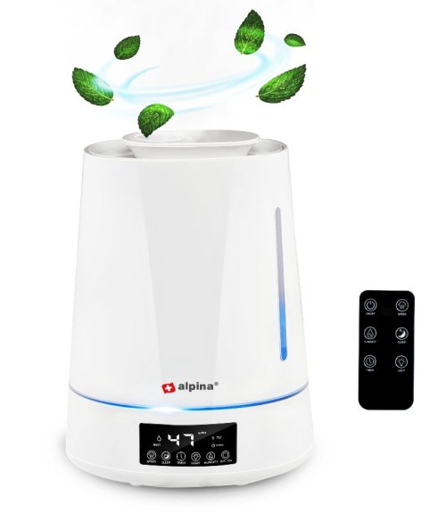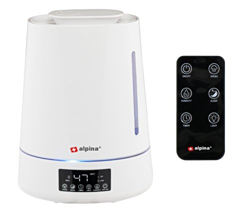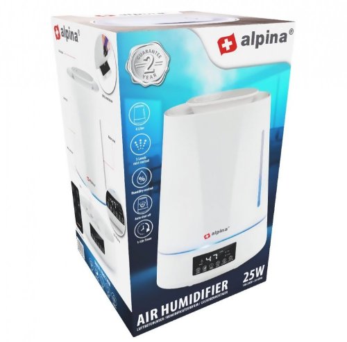 Zvlhčovač vzduchu – tento zvlhčovač vzduchu vytvára hmlu, aby zvlhčoval vzduch vo vašom dome. To pomáha pri suchej pokožke, popraskaných perách a upchatom nose . Difúzna vlhkosť – so zvlhčovačom vzduchu alpina určujete vlhkosť vzduchu vo vašej domácnosti. Zvlhčovač je nastaviteľný v 5 stupňoch od 45 % do 90 %. Aeroma difúzor s hmlou – tento zvlhčovač vzduchu má tri nastavenia hmly. Vyberte si nízky, stredný alebo vysoký stupeň rozprašovania. Pre zážitok z vône pridajte kvapky aromatického oleja. Časovač a automatické vypnutie – difuzér sa automaticky vypne, ak obsahuje príliš málo vody alebo keď je dosiahnutá požadovaná vlhkosť vzduchu. Môžete tiež nastaviť časovač. Diaľkové ovládanie a LED displej – zvlhčovač vzduchu môžete ovládať pomocou LED displeja alebo pomocou diaľkového ovládania, ktoré je súčasťou dodávky, z vášho kresla alebo postele. Špecifikácia zvlhčovača vzduchu Alpina Napätie: 100 V - 240 V Frekvencia: 50 ~ 60 Hz Príkon: 25 W Obsah: 4 litre Dosah: 15 až 30 metrov štvorcových Tri režimy striekania: nízky, stredný, vysoký spínacie hodiny: 1-12 hodín kontrola vlhkosti 45% -90 s filtrom a arómou boxom, automatické vypnutie pri nedostatku vody, nočné svetlo