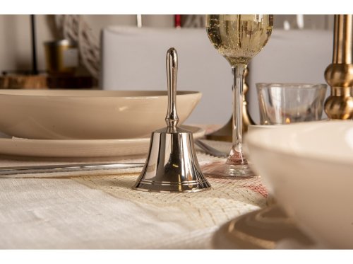 Vianočný zvonček vyrobený zo zliatiny kovov, v mixe designov - hladký alebo jedným či viacerými ozdobnými prúžkami. Rozmery: spodný priemer 3,5 cm, výška 11 cm. Farba: zlatá.