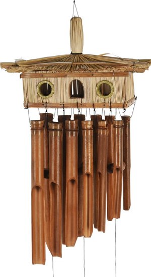 zvonkohra bambusová (gigantochloa apus lakovaná) s vtáčou búdkou (imperata cylindrica lakovaná), rozmer vtáčej búdky 30x12xh17cm, vrátane 12 zvonkohier, celková dĺžka vrátane lana je 80cm