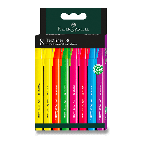 Súprava 8 kusov kvalitných superfluorescenčných zvýrazňovačov Faber-Castell Textliner 38. Šírka stopy 1 a 4 mm.
