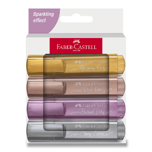 Plochý zvýrazňovač Faber-Castell Textliner 46 Metallic v štyroch netradičných odtieňoch s metalickým efektom.