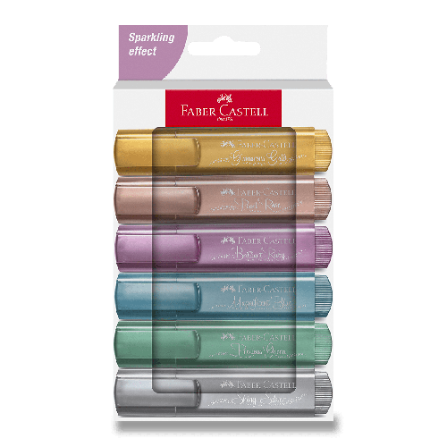 Plochý zvýrazňovač Faber-Castell Textliner 46 Metallic v šiestich netradičných odtieňoch s metalickým efektom.