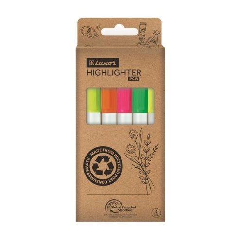 Ekologické zvýrazňovače Luxor Netoxické, ideálne pre texty, kópie a faxy Skosený hrot pre hrubé alebo tenké linky Šírka stopy: 1,0 mm Farby: 2x žltá, ružová, oranžová a zelená