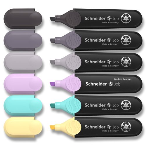 Plochý zvýrazňovač Schneider Job s viečkom vo farbe atramentu v súprave 6 pastelových farieb.