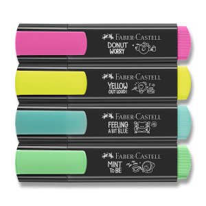 Súprava plochých zvýrazňovačov Faber-Castell Textliner 46 v 4 odtieňoch v modernom graffiti dizajne.